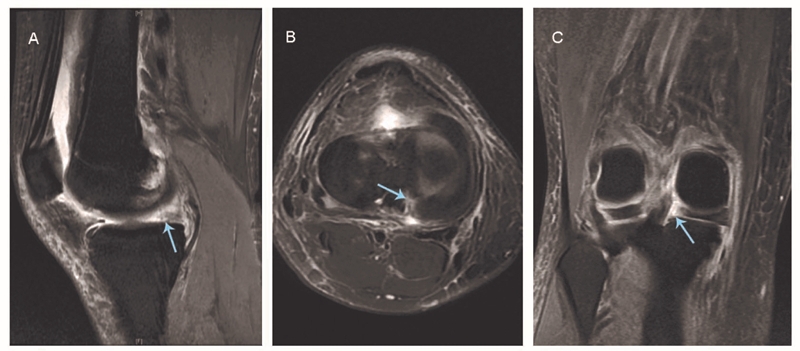 A:矢状位无正常半月板信号:鬼影征(箭头所示);B:轴位图像显示内侧半月板后根部放射状线形缺损(箭头所示);C:冠状位表现为内侧半月板后内缘走形突然中断(箭头所示)