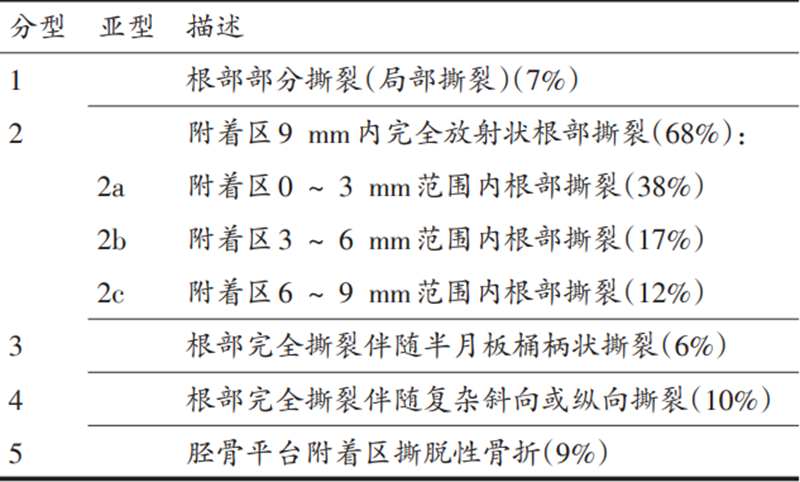 LaPrade等根据关节镜下内侧半月板根部撕裂的形态学及撕裂的程度对MMPRTs进行分型。其中包括五型:根部部分撕裂(1型)、附着区9mm内完全放射状撕裂(2型)、根部完全撕裂伴随半月板桶柄状撕裂(3型)、根部完全撕裂伴随复杂斜向或纵向撕裂(4型)、胫骨平台附着区撕脱性骨折(5型)(图2)。其中2型最常见。如表1所示。