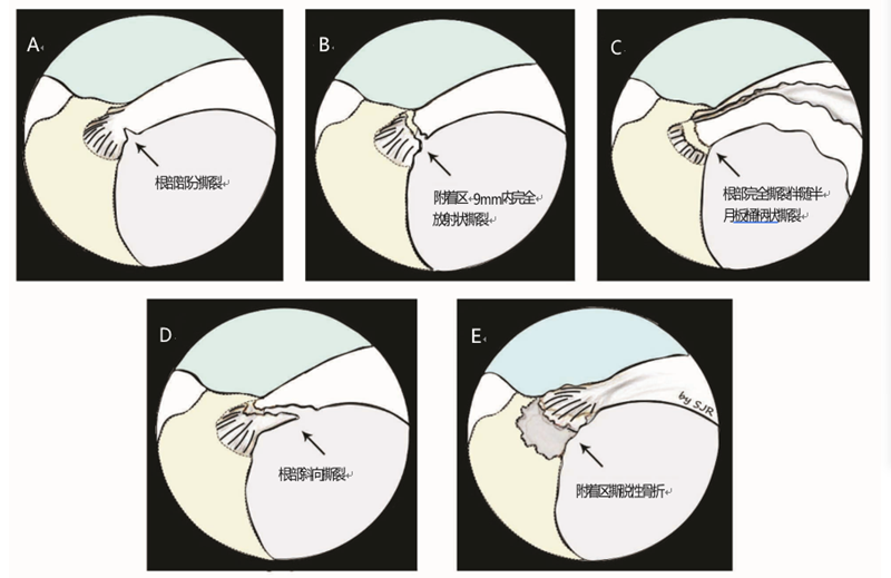 A:根部部分撕裂(1型);B:附着区9mm内完全放射状撕裂(2型);C:根部完全撕裂伴随半月板桶柄状撕裂(3型);D:根部完全撕裂伴随复杂斜向或纵向撕裂(4型);E:胫骨平台附着区撕脱性骨折(5型)