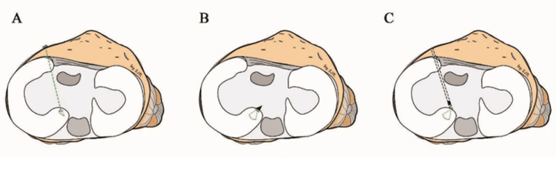 内侧半月板后根部位于胫骨平台后交叉韧带附着点的前方,缝合铆固定技术要求膝关节在术中保持深度屈曲,以使缝合铆能够进入内侧半月板后根部的适当位置,而膝关节深度屈曲导致关节间隙缩小,关节镜下视野不佳,导致很难获取合适的位置,尤其是肥胖的患者。因此,对于外科医生来说,能够以这样的角度将缝合铆放置在合适的插入点是有难度的。此外高的后内侧入路会导致神经血管损伤的风险增加。为了避免术中膝关节过度屈曲以及高的后内侧入路带来的不便,Lee和Somsak等描述了一种通过弯曲的导向器和软缝合铆进行半月板锚定缝合的技术。该技术通过常规后内侧入路,在膝关节屈曲60°的情况,通过弯曲的导向器就可将软缝合铆垂直固定于胫骨平台半月板后根附着区处,避免了高后内侧入路带来的软组织和神经血管损伤风险,且适用于肥胖患者。此外,在弯曲导向器的作用下确保了缝合铆垂直置入胫骨平台,且膝关节屈曲在90°以下,能够获得最佳视野。
