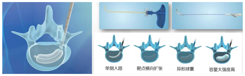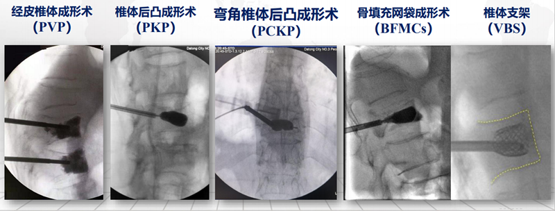 目前常见的手术方式有经皮椎体成形术(percutaneous vertebroplasty,PVP)、球囊扩张经皮椎体后凸成形术(percutaneous kyphoplasty,PKP)、弯角椎体后凸成形术(percutaneous curved kyphoplasty,PCKP)、骨填充网袋成形术(bone filling mesh container,BFMCs)和椎体支架成形术(vertebral body stenting system, VBS)。这五种手术方式各有其优势和缺点。