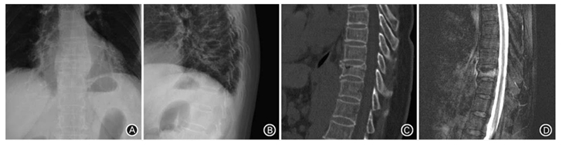 A、B. 术前正、侧位X线片示T10压缩骨折;C. 术前CT矢状位重建示T10压缩骨折;D. 术前MRI抑脂像示T10为新鲜骨折
