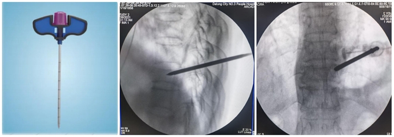 (1)定位与穿刺:透视下确定伤椎椎弓根外缘上1/3 入路点及伤椎上终板或下终板方向并做好标记。由于穿刺容错率高,穿刺针(4. 2 mm)不用过度内倾,不必苛求针尖在椎体内侧壁、后壁位置,穿刺针从椎弓根外缘沿椎弓根方向缓慢穿刺入椎体即可,针尖务必穿刺入椎体后1/3。