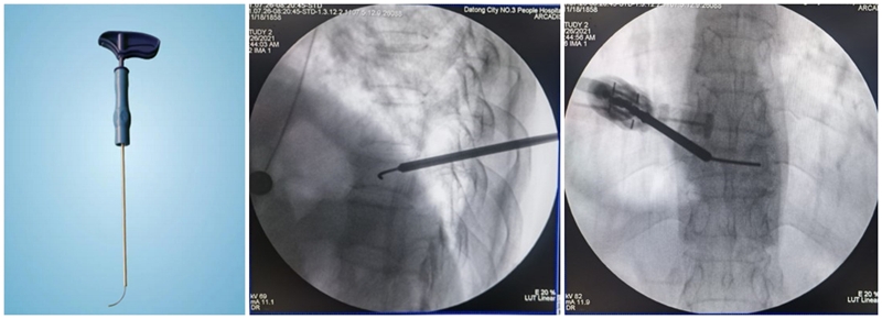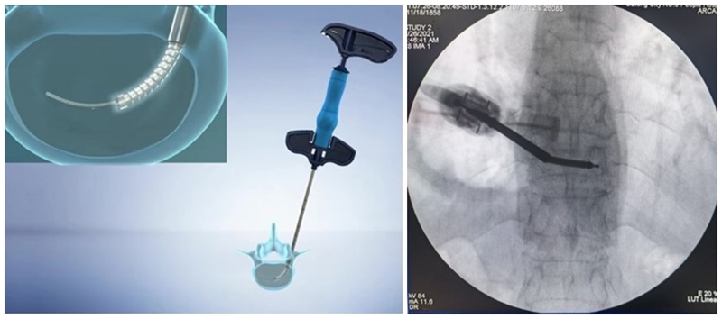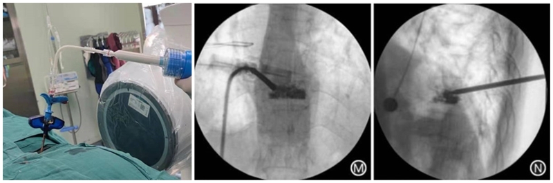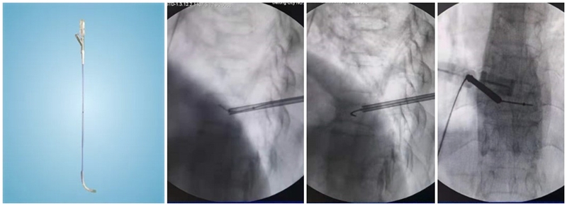 (4)置入球囊:插入带导丝弯角球囊时注意透视球囊方向,反复调整务必与终板平行。如需要拔出球囊调整方向,务必先拔导丝再拔球囊,透视球囊标记点必须完全从工作套管内出来,否则易造成弯角球囊与工作套管边缘卡磨破裂。