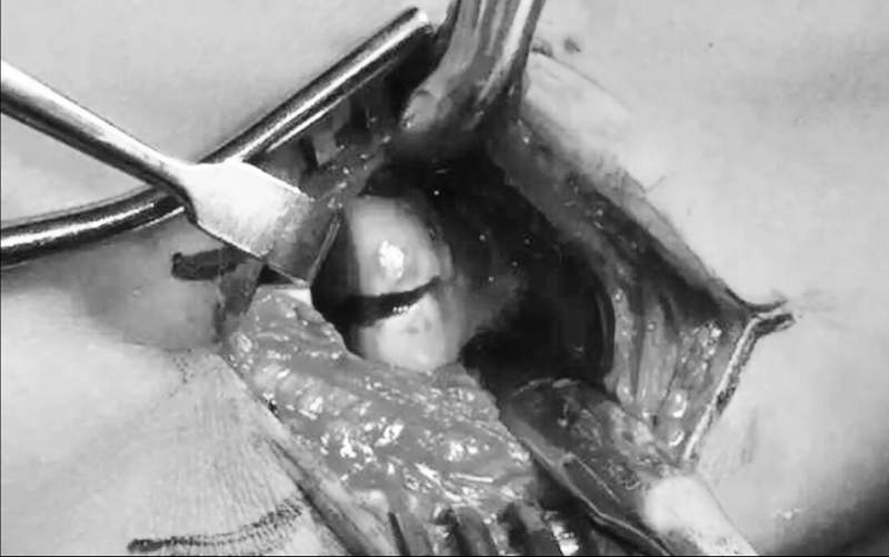 图3 EDC入路指总伸肌劈开入路DC入路中,确定DC肌后,自其在肱骨外上的起点正中间切开,向远端题伸至肱桡关节以远25mm处,在外侧切带复合体(起于肱骨止于尺骨),在其尺骨附着点的前方切开外侧关节囊