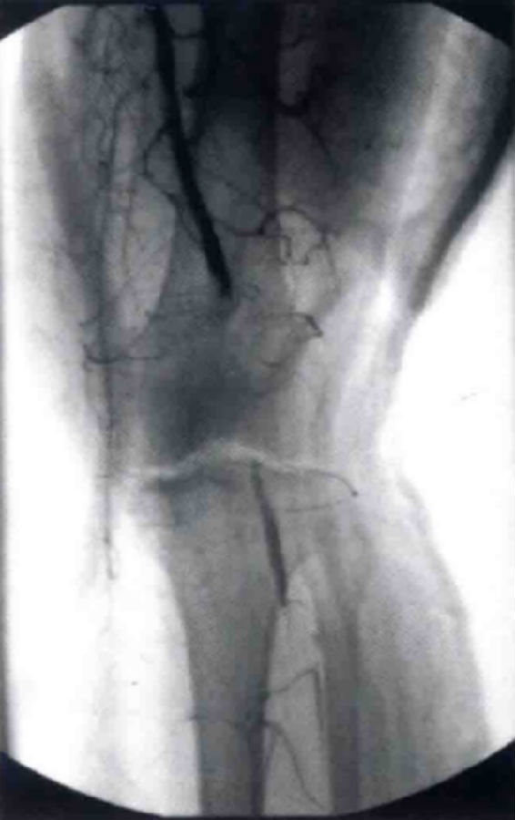 图1 膝关节脱位导致腘动脉损伤的血管造影图像