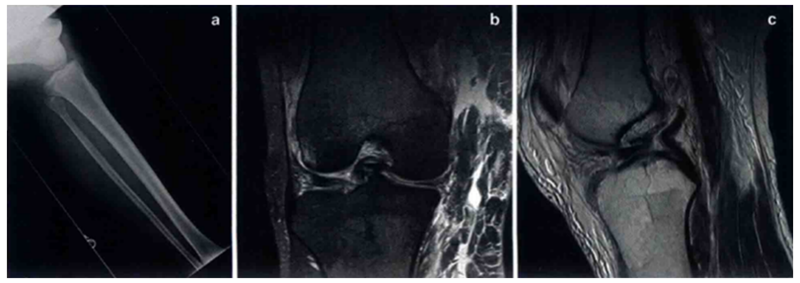 图2 a为同一个患者的膝关节脱位时的X线片。b冠状位和c矢状位MRI显示ACL、PCL和半月板桶柄状撕裂。冠状位还显示MCL损伤