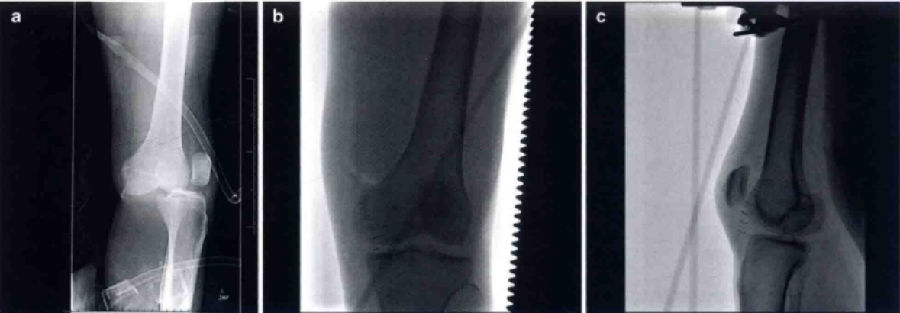 图3 a为后外侧脱位的印象学检查。这种膝关节脱位是可复性的,需要做一个将MCL插入关节的开放性复位。b和c分别是复位后的前后位片和侧位片