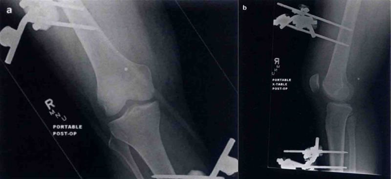 图4 对前后(a)侧方(b)的膝关节不稳定脱位采取跨关节外固定支架固定