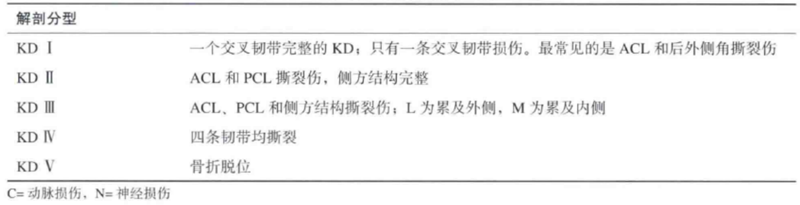 与其他几种分型系统对比,解剖分型有几个显著的优势。首先,对所有的KD分型都可以使用这个系统,包括已经复位的多发韧带损伤。其次,该系统可以评估损伤的严重性并可估计预后。通常来说,罗马数字越大,膝关节损伤就越严重,预后越差。在KDV型中,由于股骨胫骨关节损失了所有的韧带结构,很可能合并血管损伤。再次,解剖分型已明确了需要重建或修复的损伤结构,有助于指导治疗。最后,解剖分型可以在相关医师之间进行简单的交流。比较治疗结果。
