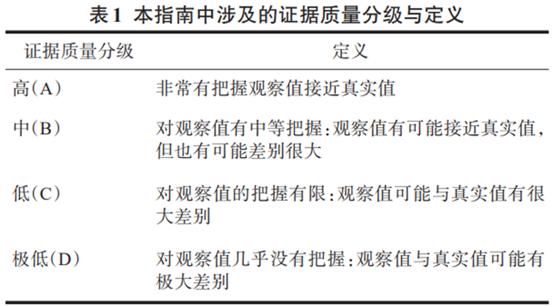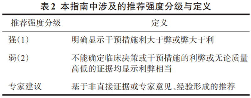 本指南采用推荐意见的分级评估、制定及评价(Grading of Recommendations Assessment,Development,andEvaluation,GRADE)方法对证据体的证据质量和推荐意见的推荐强度进行分级。GRADE证据质量和推荐强度分级与定义见表1和表2。采用德尔菲法进行4轮函询后形成专家意见,专家对推荐意见可根据赞同程度选择“同意”“不确定”或“不同意”。