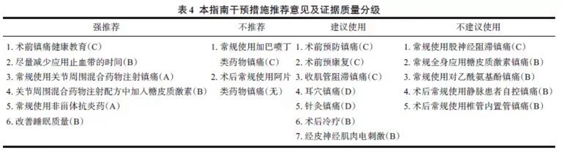 推荐意见:建议术前使用预防镇痛,可以减轻TKA术后疼痛,目前对于药物的构成尚无标准方案。(证据等级C;推荐强度2)(专家意见:同意100%,不确定0,不同意0)