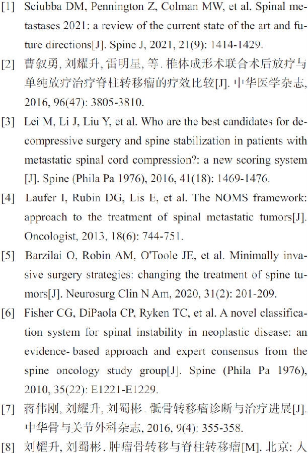 随着全身治疗水平的提高,恶性肿瘤患者的生存期逐渐延长,预计每年新增超100000例需要接受治疗的脊柱转移瘤患者[1]。脊柱转移瘤患者通常表现为腰背痛、脊柱不稳及脊髓或马尾受压导致的感觉和运动功能障碍、大小便失禁,甚至瘫痪,这些症状均会严重影响患者的生活质量[2]。