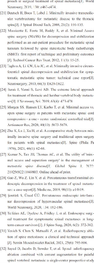 近年来微创技术和内固定器械得到了广泛应用,脊柱转移瘤的手术方式也发生了很大变化。传统的开放手术虽然可以缓解疼痛和神经功能损害,但对脊柱转移瘤患者的筛选有严格的要求,通常要求预计生存期>3个月[3]。