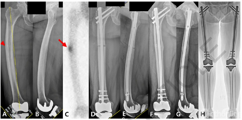 2.2 非典型股骨骨折:Yoon YC[48]介绍了通过矫正截骨、髓内钉可附加钢板强化固定治疗前外侧弓角度增加引起的不完全非典型股骨骨折治疗方法(图7)。20例股骨中有19例在平均24.9周内实现了初次骨愈合。2例延迟愈合,分别于36周和40周愈合。侧弯角度、前弯角度和股骨远端外侧角术后均有显著改善。1例骨不连,附加钢板强化、未植骨后愈合。