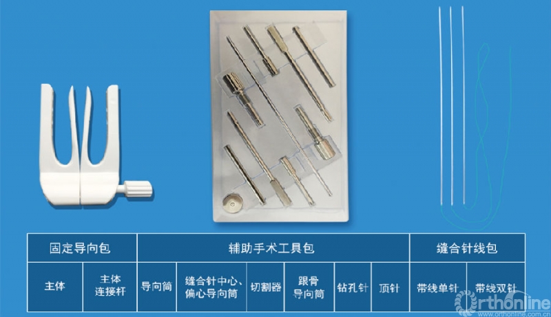 ①尽管三组在3、6、12个月功能评分ATRS与生活质量评分SF-36无明显差异,3组总的严重并发症发生率无明显差异。但分析其严重并发症,微创组腓肠神经损伤发生率高达5.2%,占总的严重并发症的60%,而此并发症可以通过改进手术技术大大降低,笔者团队设计的跟腱辅助微创缝合系统(图8)则通过设计过线套筒从而避免腓肠神经损伤,将使该并发症大幅降低[50, 51],从而改变结局,该技术已获得广泛推广[52]。