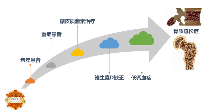 最新研究表明,新冠感染患者的骨密度在出院后平均81(±48)天平均下降8.6%(±10.5%),且骨密度下降明显大于年龄相关的骨质流失,导致骨质疏松症的发生率增加了两倍[1]。患者自身因素、COVID-19本身及其治疗都与骨质疏松症的发生增加有关。其可能原因包括以下: