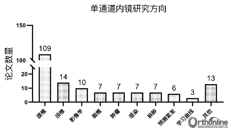 在2022年的论文中有6篇文章比较了单通道与双通道脊柱内镜治疗腰椎疾病的临床效果,针对腰椎间盘突出症两者均可以获得非常满意的临床疗效。有研究认为:相比双通道内镜,单通道内镜具有失血量少、手术时间短、住院时间短等优点[2],也有研究认为双通道内镜具有复发率较低、学习曲线短、髓核残留率低、视野范围大等优点[3]。另有论文认为双通道内镜在治疗腰椎管狭窄症方面、后路椎间融合方面优于单通道内镜[4, 5]。