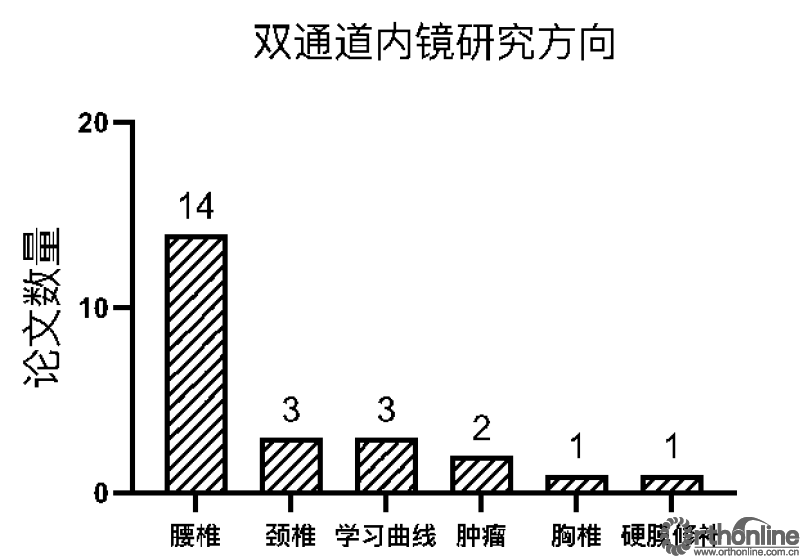 我们将最后的论文进行进一步分类:文献关键词聚类分析图(见图1)。主要热点方向为单通道脊柱内镜相关论文192篇,双通道脊柱内镜论文24篇,其中单-双通道脊柱内镜比较的论文占6篇(见图2)。