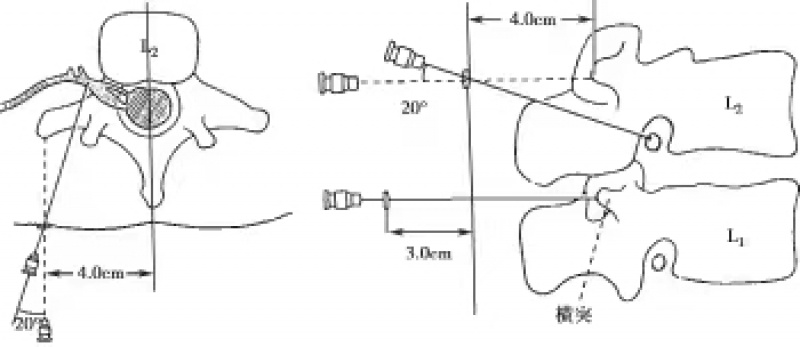 图1 穿刺示意图 A.冠状位中线旁开约4cm,平横突下沿进针,向内偏20°;B.矢状位上平横突下沿进针,向下偏约20°(图片引用自:Tajima T, Furukawa K,Kuramochi E.Selective lumbosacral radiculography and block.Spine,1980,5(1):68-77)