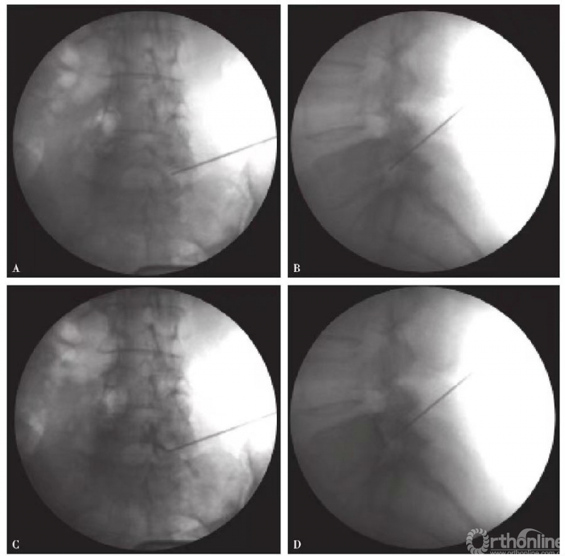(1)6号或者9号腰椎穿刺针,透视下穿刺至神经根出口区(图1):