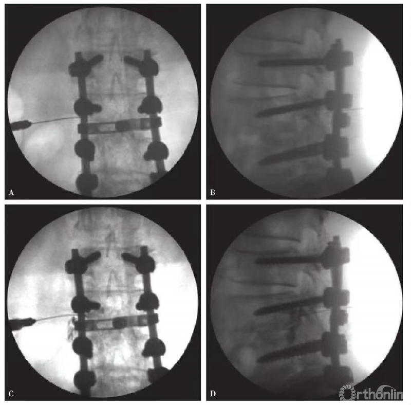 图2 选择性腰5神经根造影 A、B.穿刺成功正侧位片;C、D.造影后正侧位片