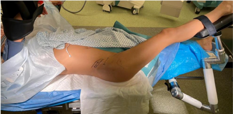 虚线所示的皮肤切口(比基尼切口;右臀部)平行于骨盆边缘,中心位于ASIS下方约2cm,髂嵴上长度为5-8cm。