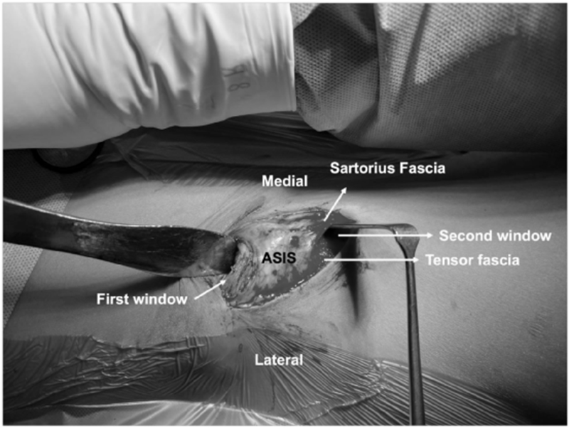 显示Smith-Petersen入路的两个窗口。第一个窗口在近端,于髂肌处骨膜下方插入拉钩。第二个窗口在缝匠肌和阔筋膜张肌之间。
