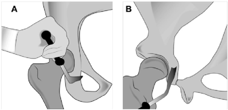 A.图显示用倾斜的Ganz骨刀进行髋臼下截骨。B.后柱的侧视图,显示向坐骨棘倾斜的不完整坐骨截骨。需要多次内侧和外侧击打确认截断整个厚度的坐骨。在截骨过程中伸展下肢,保护坐骨神经
