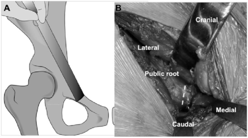 A.耻骨截骨线位于耻骨跟部内侧几毫米处向内倾斜。B.内侧骨撬插入耻骨,近端与远端骨撬插入闭孔,以保护闭孔神经血管束。虚线显示截骨的位置。