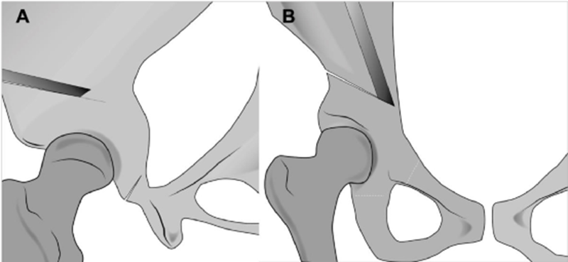 A.图示髋臼上截骨,其指向坐骨大切迹,在骨盆缘1cm处停止。B.坐骨截骨,沿骨盆內缘保留后柱截骨。