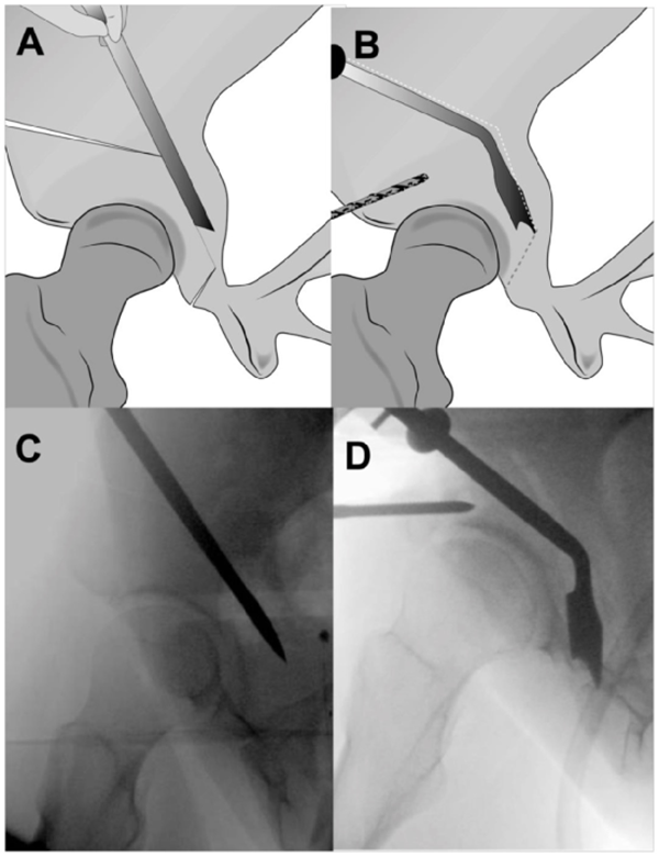 A.后柱截骨。B.成角骨刀截断残留连接处,截骨块充分游离。C.髂骨斜位透视图显示截骨线。D.游离截骨块