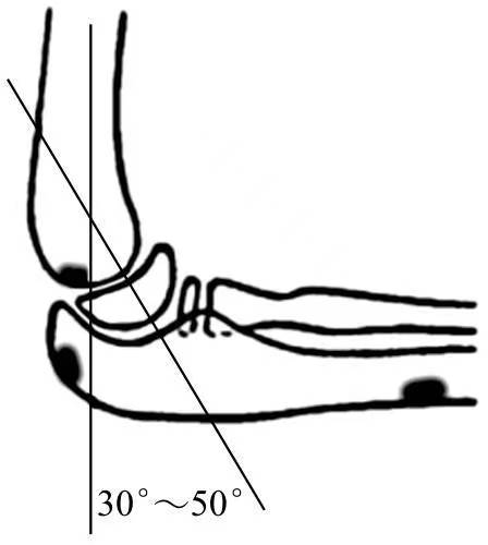 肱骨干与肱骨髁交界处容易发生骨折的原因有两点:首先此处为骨松质与骨密质交界处;其次在肱骨干轴线与肱骨髁轴线之间有30°~50°的前倾角(图2)。另外,该处前后扁薄而内外宽,呈鱼尾状,这也容易发生断裂。