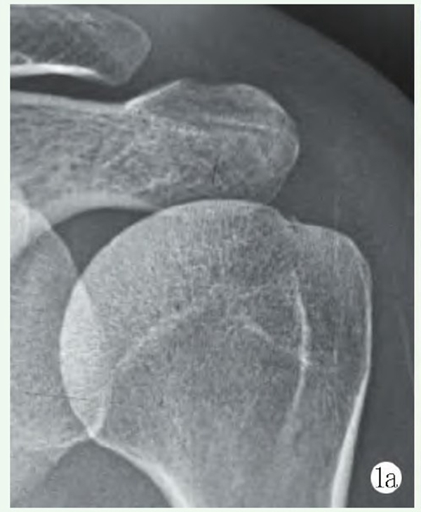 图1a:术前肩关节正位 X 线片示左肱骨头解剖颈处小骨片