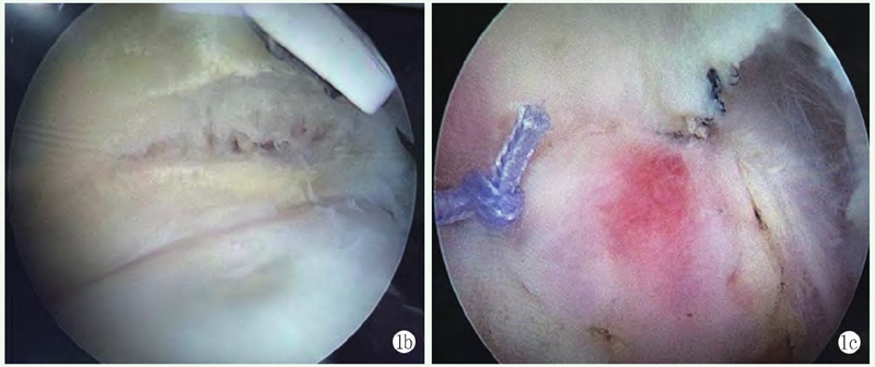 图1b: 镜下见冈上肌关节面横行撕裂;1c: 置入锚钉,用腰穿针将锚钉尾端缝线穿过冈上肌后打结固定骨折块