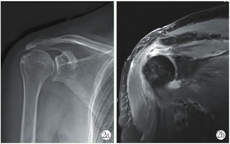图2a: 术前 X 线片示肩峰外缘增生,肱骨头上移,肩峰-肱骨距离短缩;2b: 术前 MRI 显示右冈上肌全层撕裂并回缩,轻度脂肪浸润,肱二头肌长头腱断裂