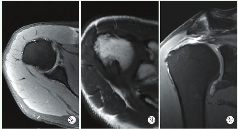 图3a: 术前MRI显示右侧前下盂唇损伤;3b: 术前MRI显示右侧肱骨后方Hill-Sachs损伤;3c: 术前MRI显示右冈上肌全层撕裂并回缩,轻度脂肪浸润
