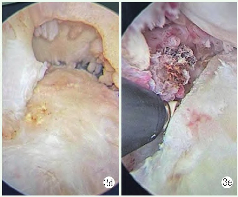 图3d: 术中镜下见撕裂的肩袖;3e: 镜下见巨大Hill-Sachs损伤,涉及大部分关节面