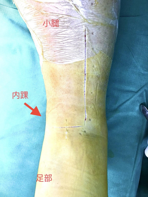 4、踝前“L”切口或反“L切口”,切口起自内踝尖下1.5cm,横过踝关节,在中线稍外侧呈弧形向近端延伸,拐角弧度为105°-110°,向近端延伸时,在胫骨嵴外侧1cm走行。