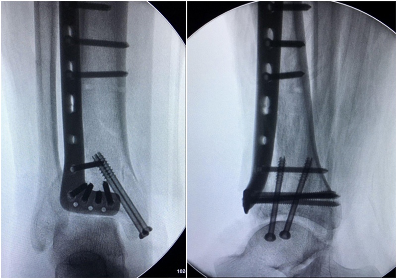 3、重新组装的胫骨远端关节面用解剖板与胫骨干连接。