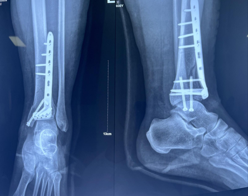 诊断:左胫骨平台后柱骨折,后交叉韧带撕脱骨折,左踝关节pilon骨折3型。