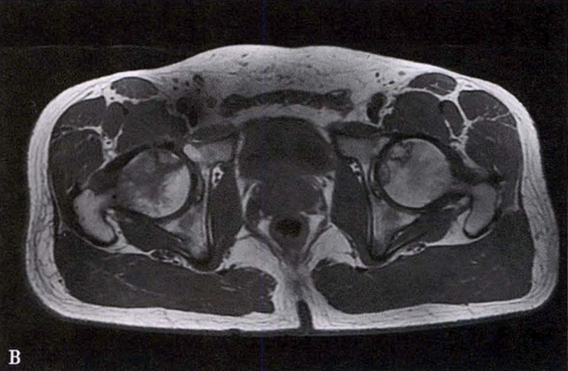 (2)MRI检查 MRI检查是早期诊断股骨头坏死最具特异性、灵敏度的检查方法。当怀疑有股骨头坏死,而X线片无明显异常时,应行MRI检查。诊断时可根据髋关节X线、MRI显示的坏死面积和塌陷程度进行ARCO分期。