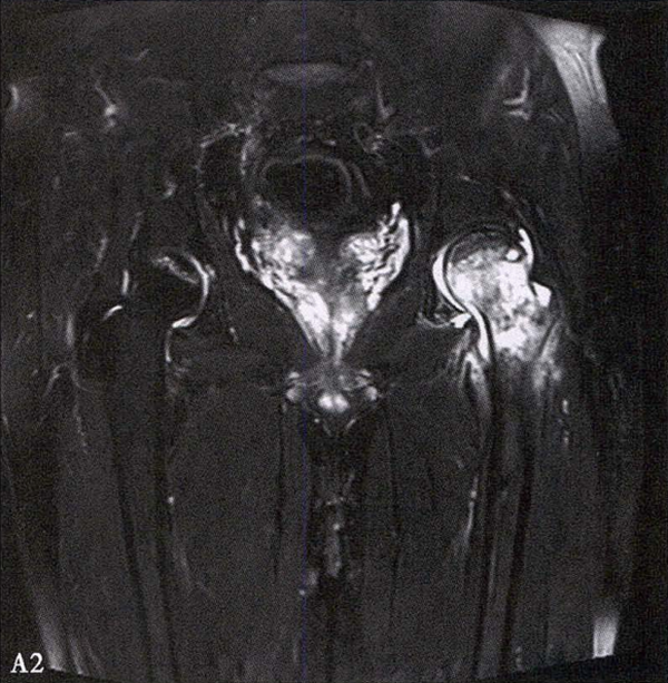 A.男性,71岁,双侧股骨头坏死,右侧Ⅰ期、左侧Ⅲ期。X线片示双侧股骨头形态可,右股骨头未见明显密度改变,左股骨头关节面下见局限性骨密度减低及增高区(A1)。MRI(T2加权像)示右股骨头内双线征,左侧不规则形混杂信号,坏死区远端骨髓水肿(A2、A3)。