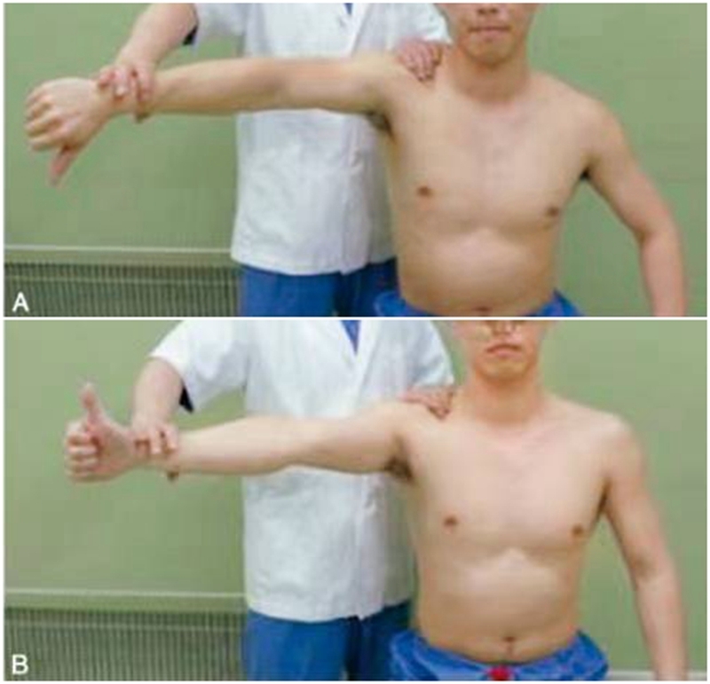 患者处于坐位或站立位,肩关节前屈90°,内收 10°~15°,肘部伸直。第一阶段使患者前臂旋前,从而使其拇指向下,这时要患者对抗阻力尽力上举患肢;第二阶段保持肩关节前屈内收位置不变使患者前臂旋后,掌心向上,再次抗阻力尽力上举患肢。如果试验第一阶段引发患者肩关节疼痛(不是肩锁关节)症状,而在第二阶段时这种疼痛症状可明显减轻,则结果为阳性(图16)。