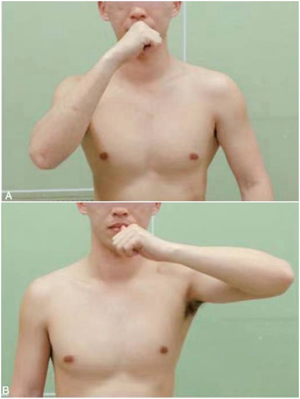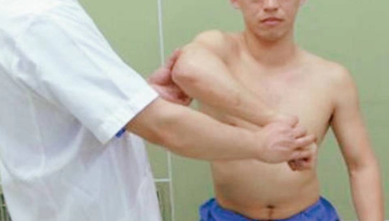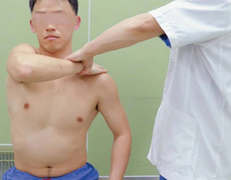 患者将患侧手置于对侧肩部,肘部下垂贴紧胸壁。若存在肩关节脱位,则患者不能完成该动作,同时伴有肩部的疼痛。若疼痛仅限于肩锁关节,则需怀疑是否存在肩锁关节的损伤。