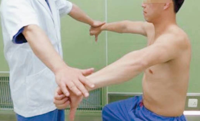 检查时,患者手搭在对侧肩部,手指张开,肘关节向前抬起;在患者予以对抗的情况下,检查者垂直向上将患手拉离肩部,则试验阳性(图8)。