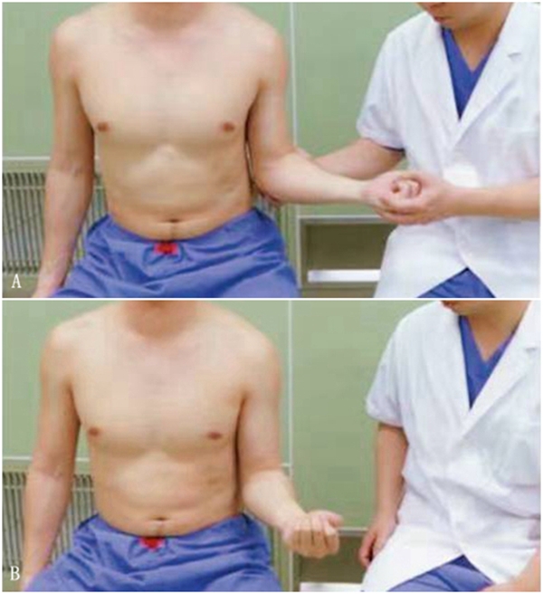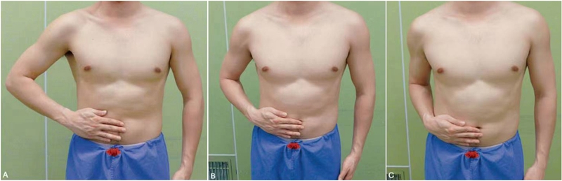 图7 Napoleon试验 A.阴性;B.中度阳性,腕关节屈曲30°~60°时手压在腹部;C.阳性,腕关节屈曲90°压在腹部