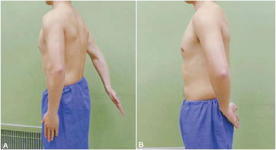 图4 外旋肌力检查 A.Lag试验;B. Lag试验阳性