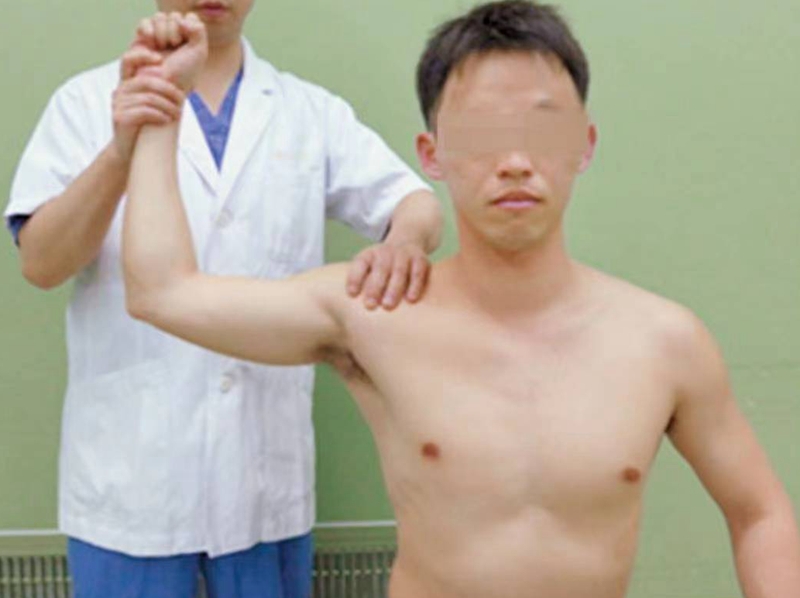 患者在肩胛骨平面保持手臂内旋,抗阻力上举,力弱或者疼痛均为Jobe试验阳性,提示冈上肌腱损伤(图3)。