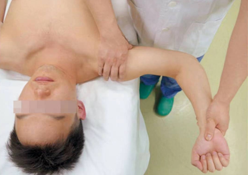 患者仰卧位,双上肢前屈上举置于检查床上。检查者站在患侧,用手压住患侧肘关节以远的前臂部位,使患者下压患肢而检查者给予对抗阻力。如果可以引出位于肩关节深方或后方的疼痛且同样动作健侧无痛,则结果为阳性(图18)。